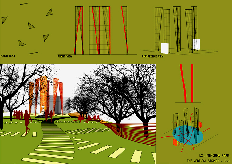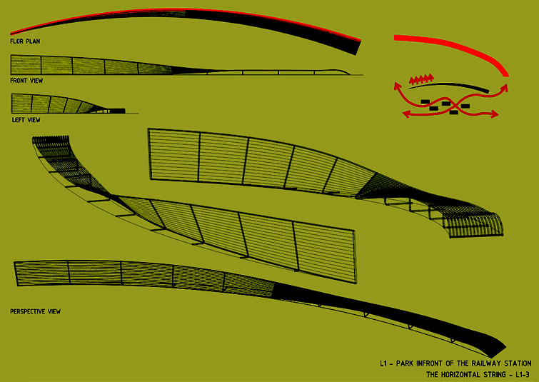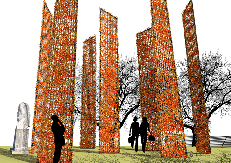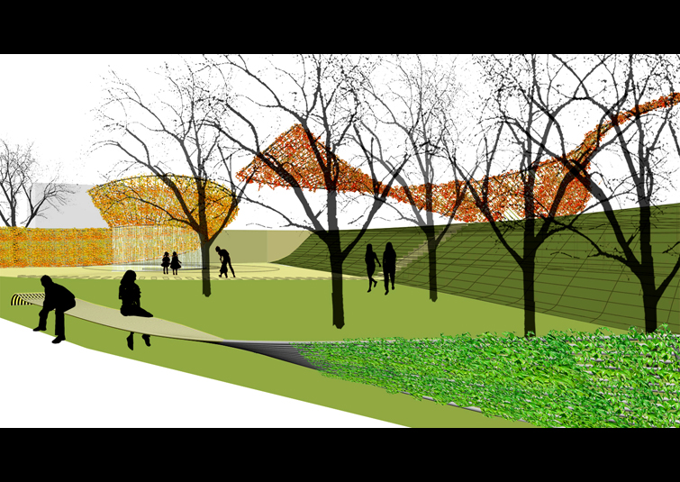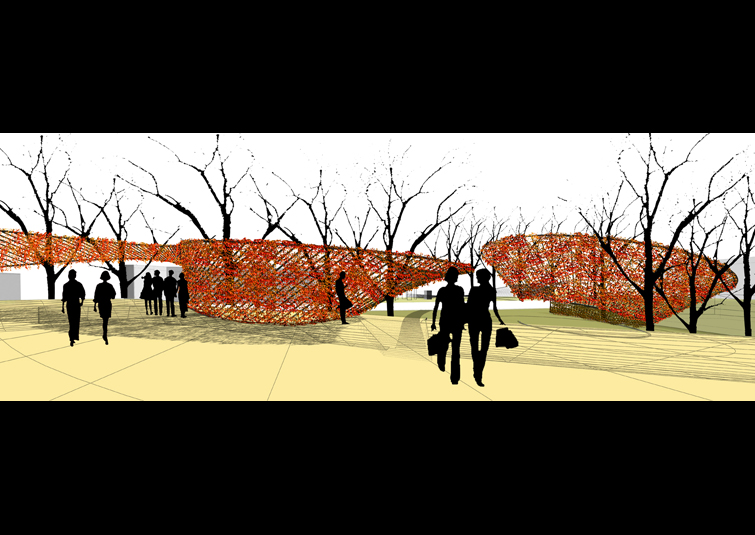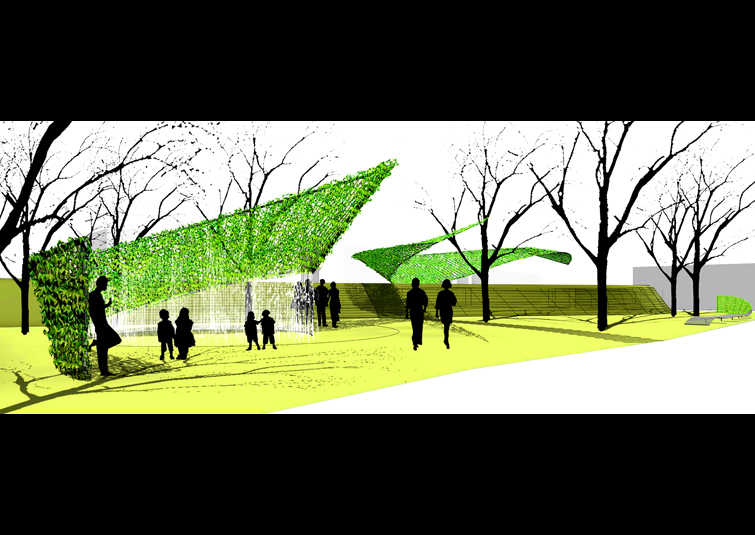 String stripes of shadow, light and vivid vegetation do not define elements, they define ambiences. Spaces of movement and spaces of rest. They twist and twine when directing and orienting, they elevate when covering and they descend when forming a bench. A bench continues into curtain, a curtain change to a roof. Strings also change through the seasons. During the winter they are uncovered steel structures, but during the spring, summer and autumn they are covered with leaves and burst with colours. In the evenings, strings glow up in light.