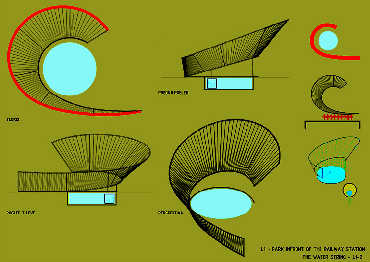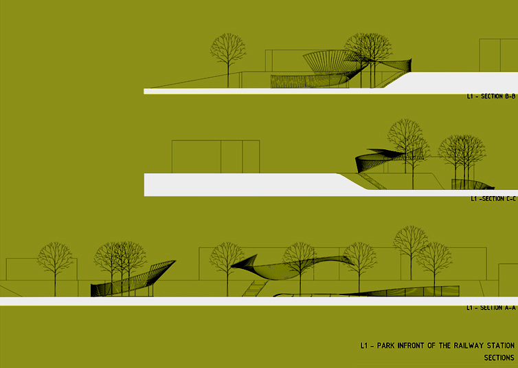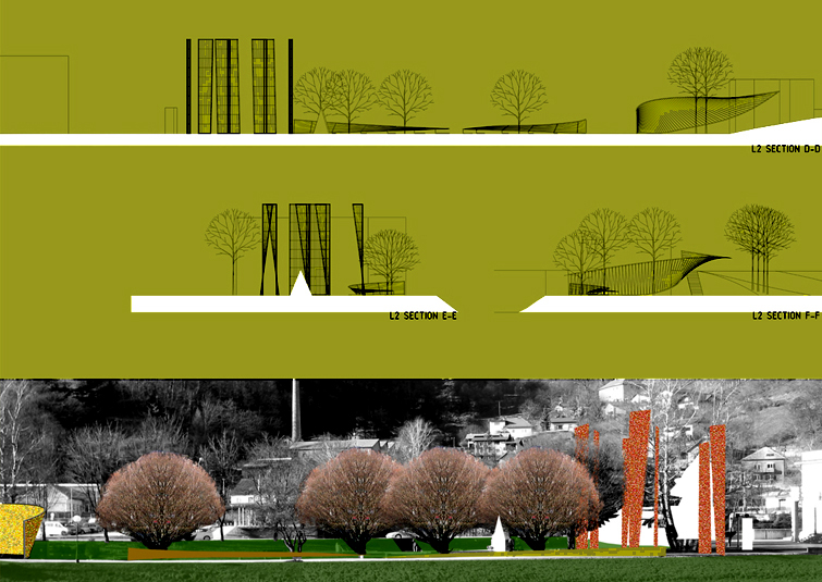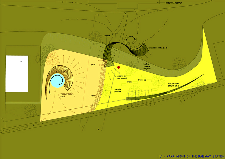 In longitudinal direction, three locations are divided by the street on one side and by the river on other side, but we don’t perceive these separations inside one of the parks. They appear visually connected as three layers of one open space. We decided to emphasize this scene also because it’s the first scene when one steps out of the railway station building. The new perception of these spaces will enable different perception of the city and a micro-expression of the public space.