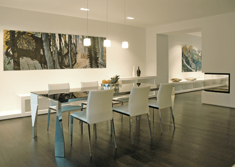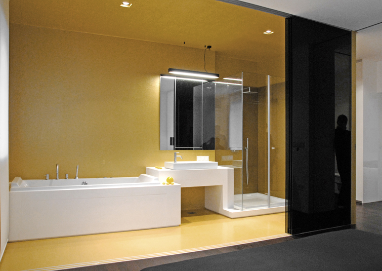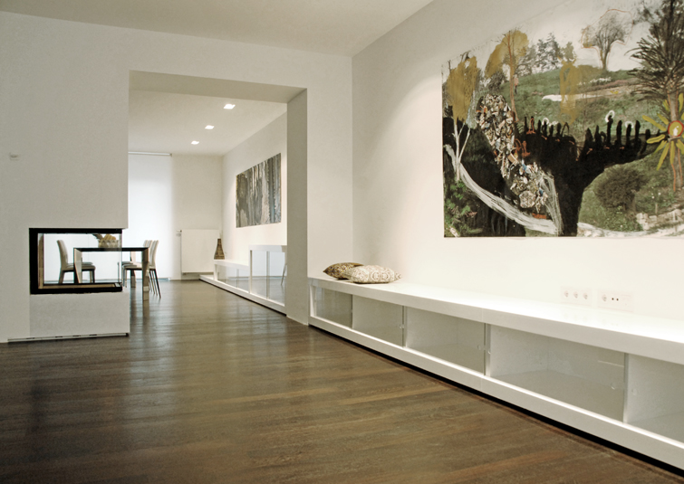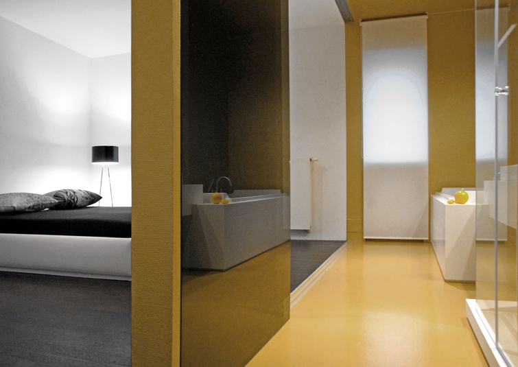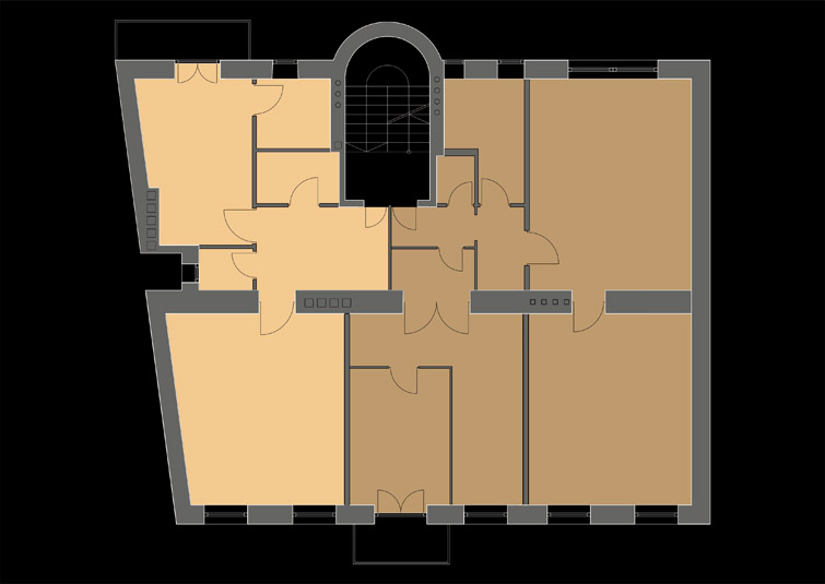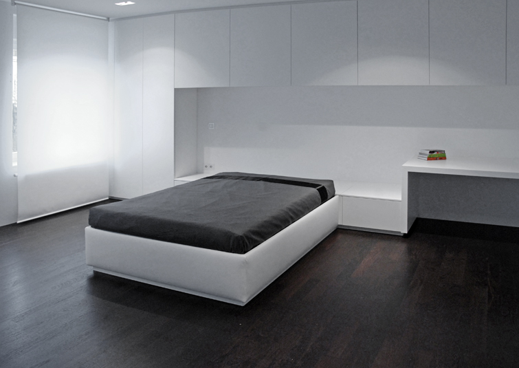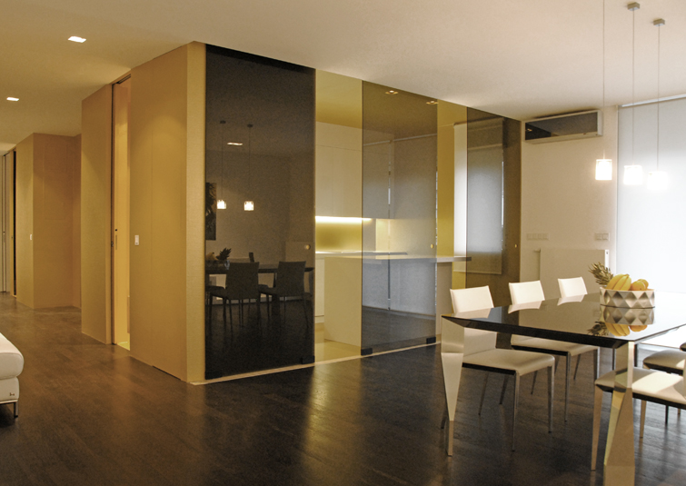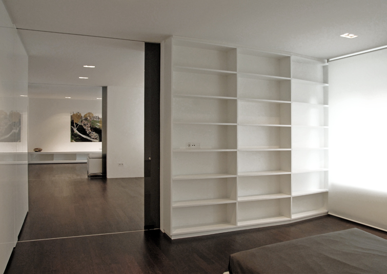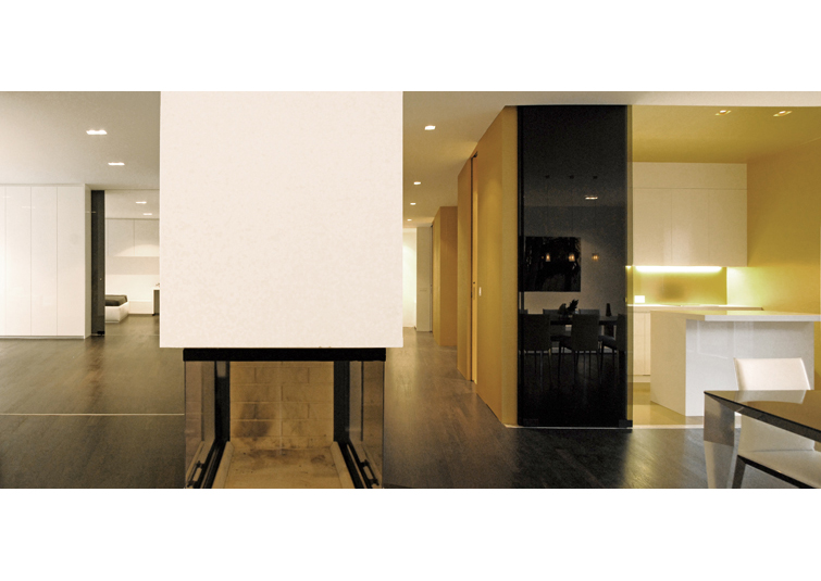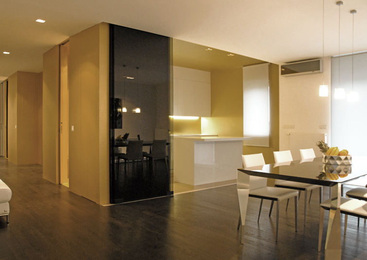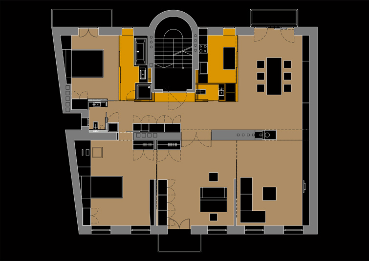 A new organizational plan followed primary logic in installation distribution, therefore most of »wet« areas were concentrated in two groups around the entrances where they used to be, but this time according to the new spatial scenographies. The rest of the apartment was divided in a day area on the right (dining room, living room and saloon) and to a night area on the left (master bedroom and guest room). A kitchen and a guest toilet belong to the »wet-day« area, a bathroom and a toilet to the »wet-night« area.