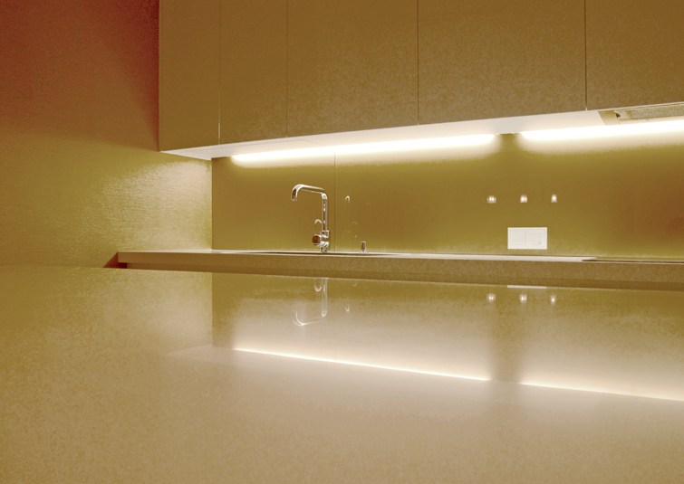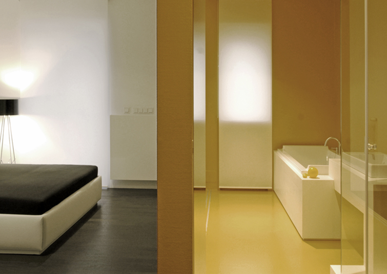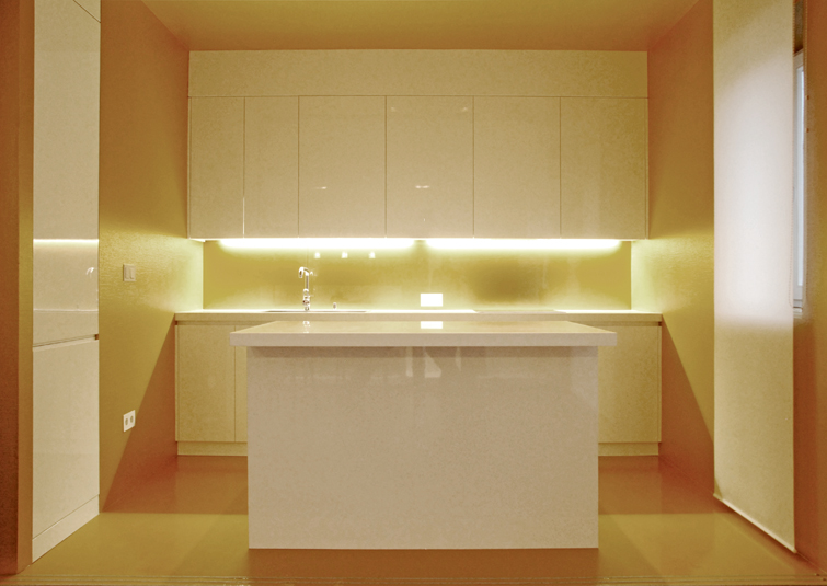 Wet areas are also distinctive in the usage of the materials. The floor, ceiling and wall surfaces are treated with same material, with a golden waterproof wallpaper protected by the epoxy film. Other parts of the apartment are left more neutral and retained using natural materials mostly. The borders between wet and dry ambiences are designed as golden curtains, soft and adjustable so the bedroom space can become one area with the bathroom, while the dining room can »pour« into the kitchen.