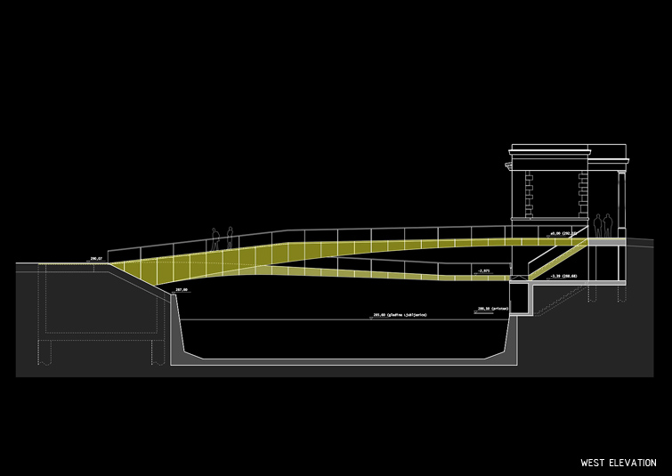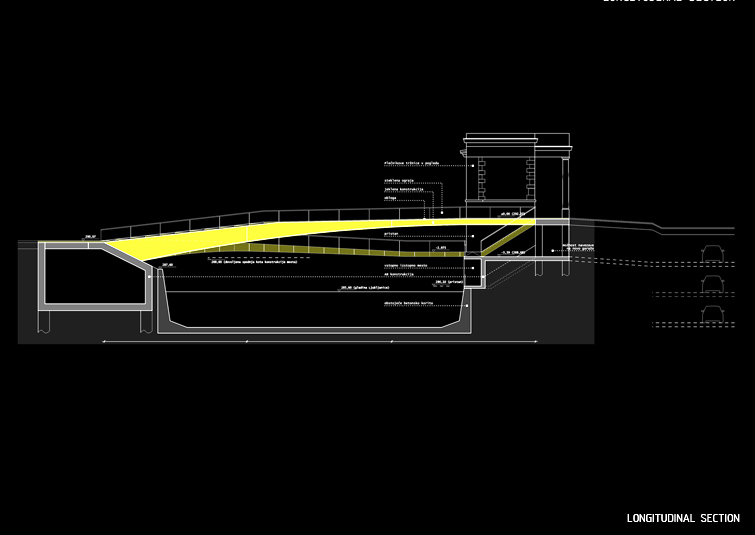 The Lower and narrow lamella descends on the lowest permitted level above the water leading to the river station for ships, thus enabling more intimate experience of the river.