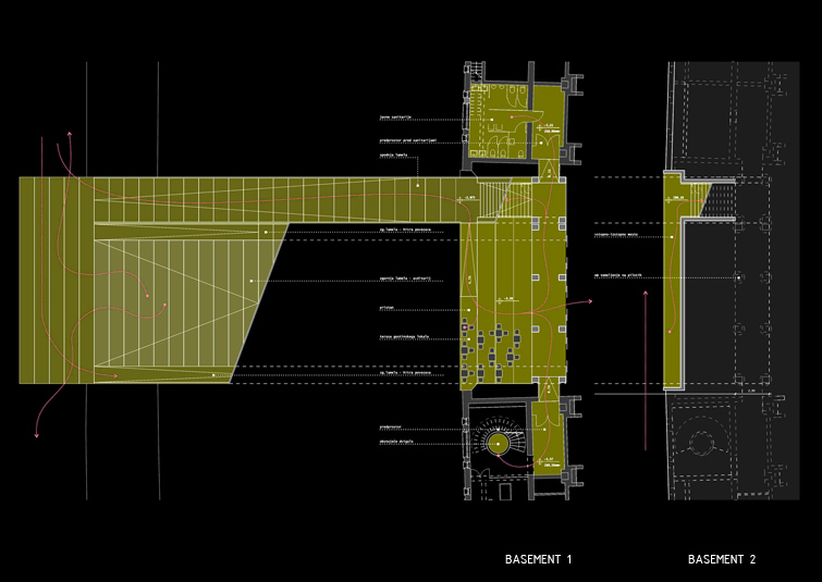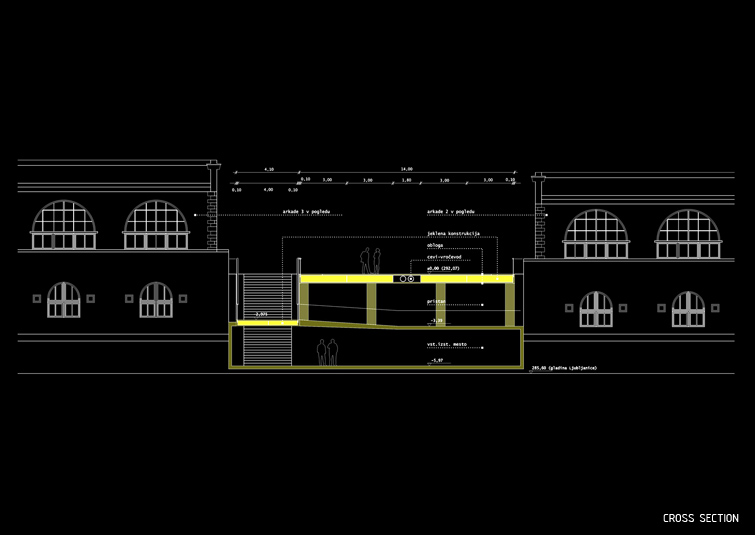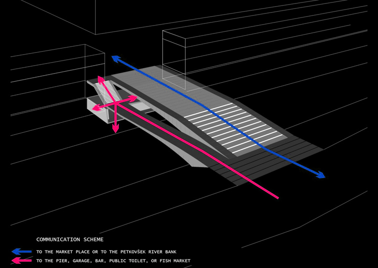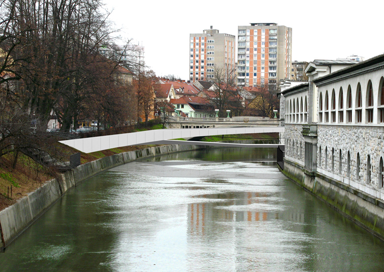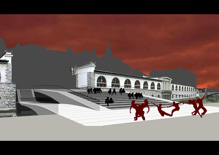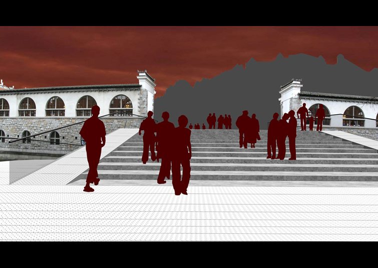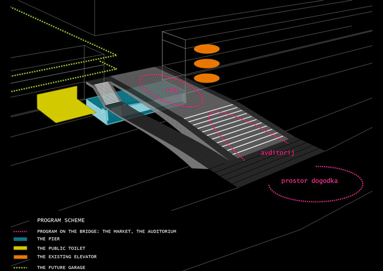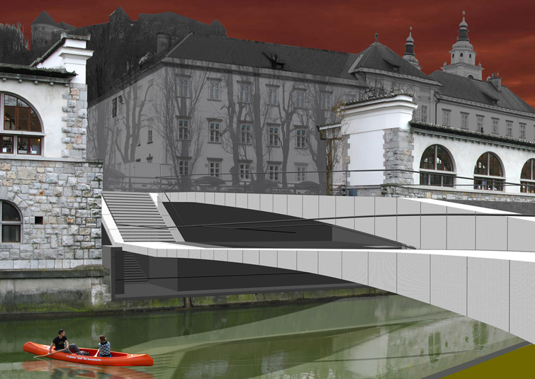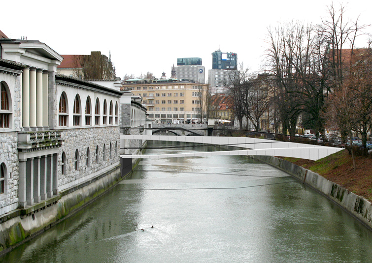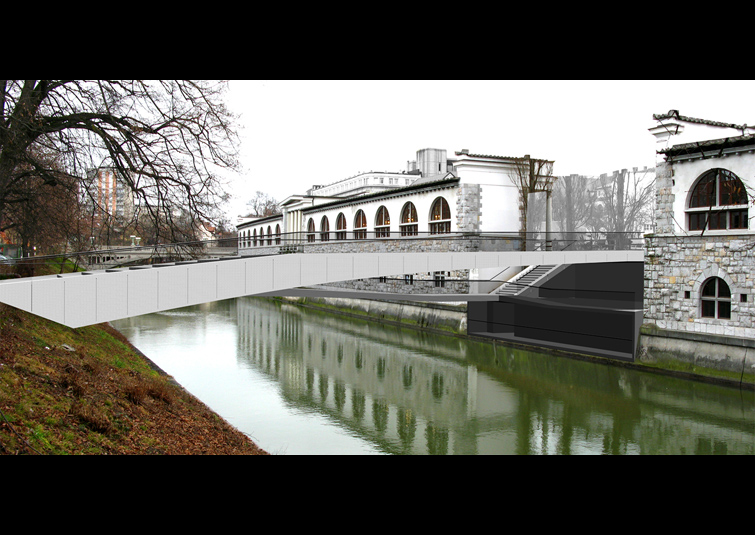 The project aim was to form a bridge which would literally »touch« the Ljubljana market location, the architectural work of Jože PleÄnik and discreetly establish connection with existing historical complex, but leaving it visually undisturbed.