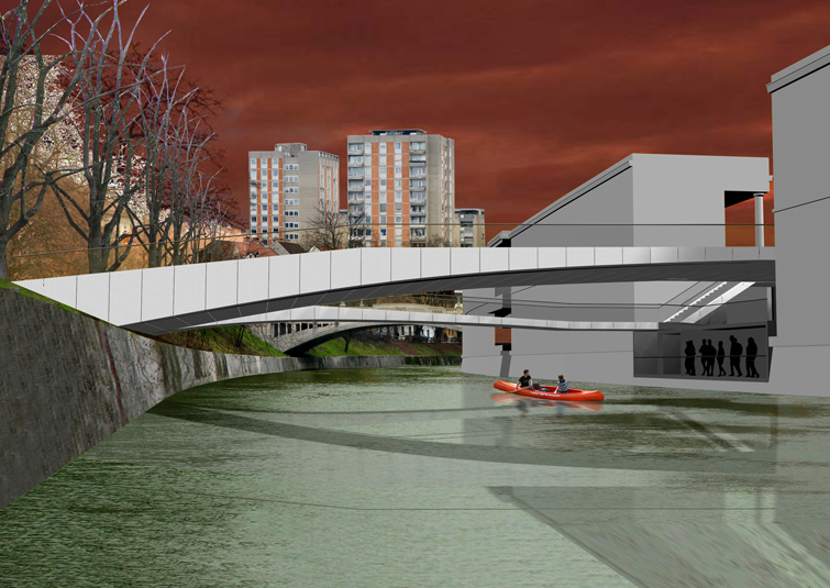 The steel construction with its constructive centre of gravity on the Petkovšek river bank enables maximal thinning of the structure, from the base of the bridge toward the market place where it reaches only 60 cm in total.
