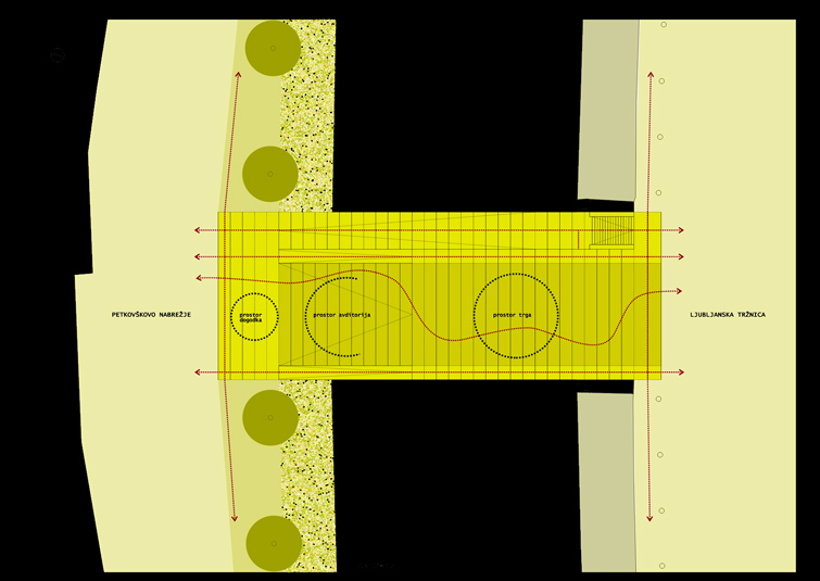 The upper and wider lamella, the square, is a platform prepared for different activities. It forms a square (26,8mx14,0m) on the market side of the river and an auditorium (14,3mx14,0m) that pours itself into the Petkovšek river bank as a stage.