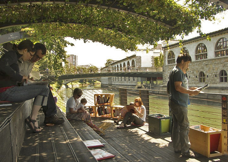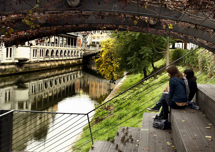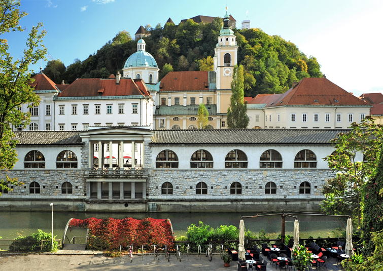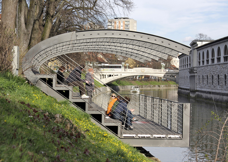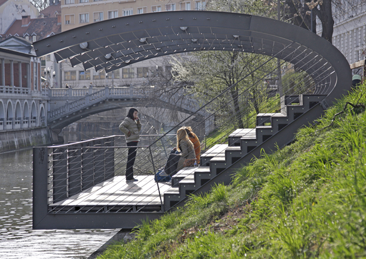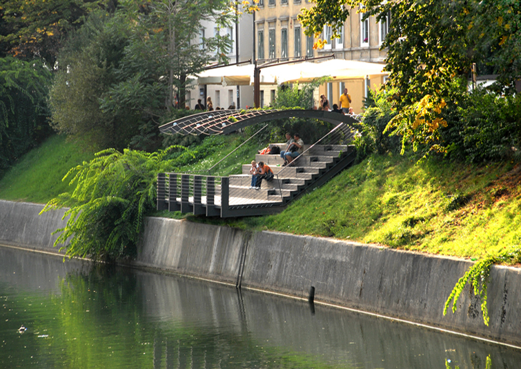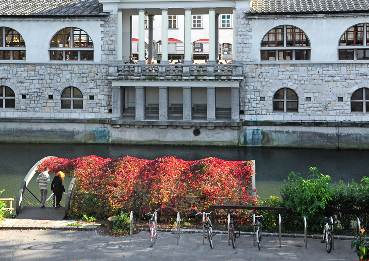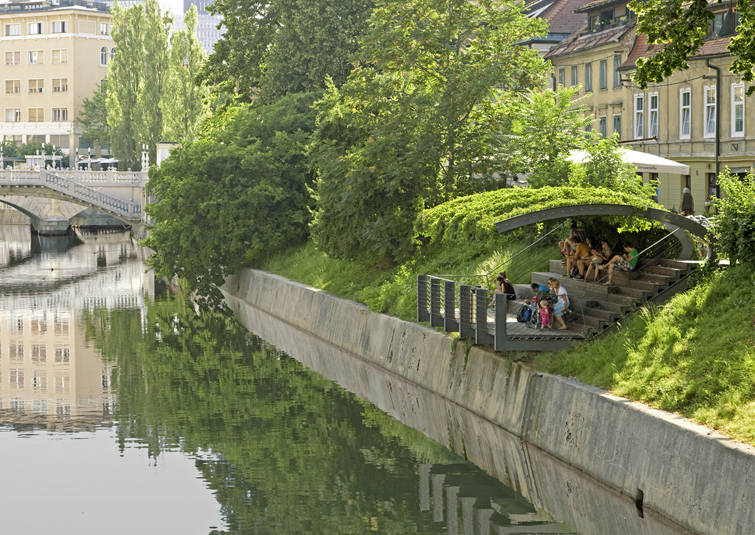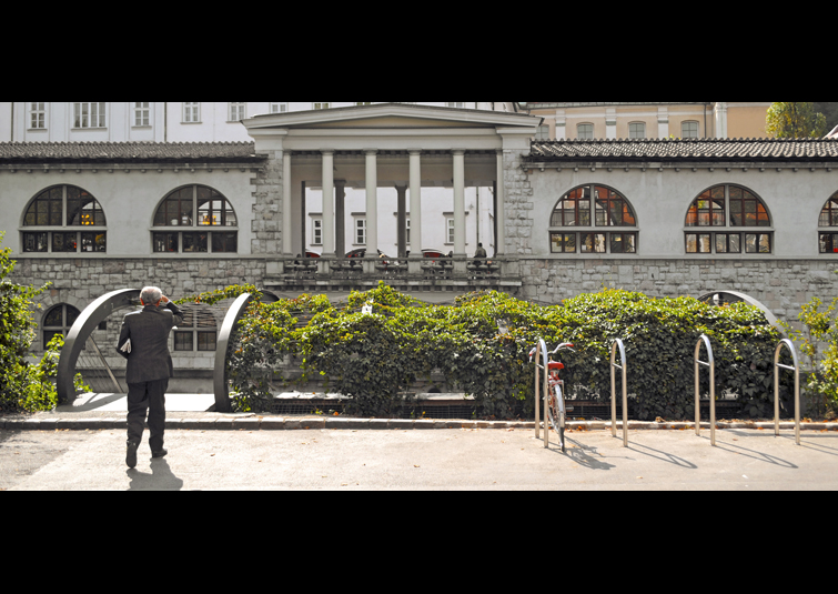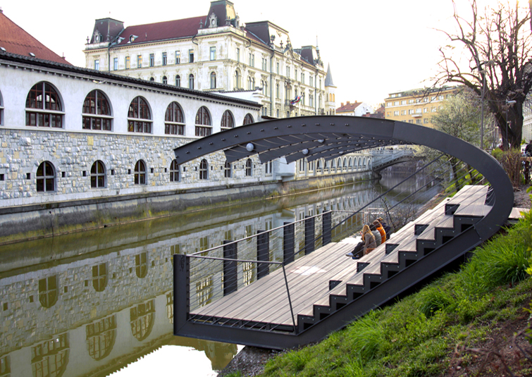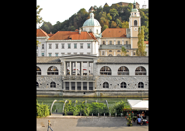 The promenade along the bank extends from the lock gate on the eastern to the confluence, where Ljubljanica river enters in the city centre on its southern side. As early as 1930 architect PleÄnik began to monumentalize this part of the bank with new bridges, terraced embankments, staircases and parks. The central part of his 2 km long large scale plan represents the monumental central market building he built along the bank on the model of classical stoa.