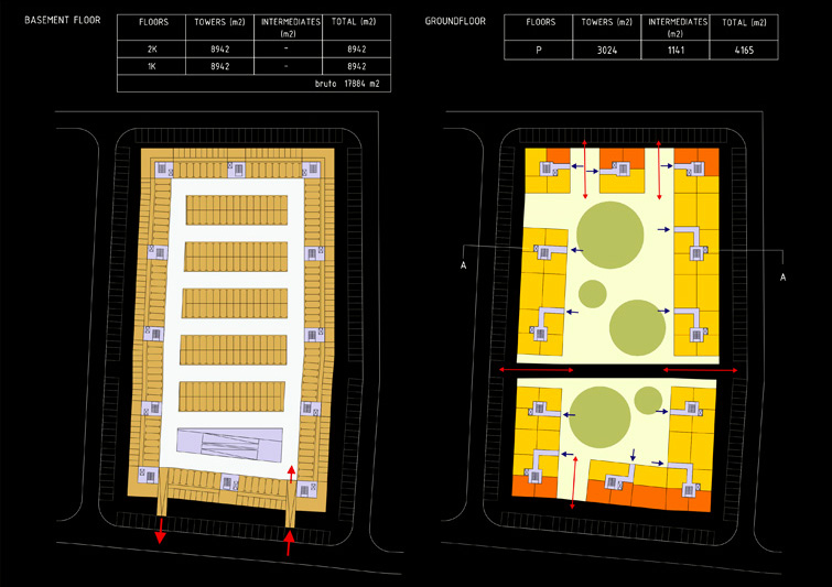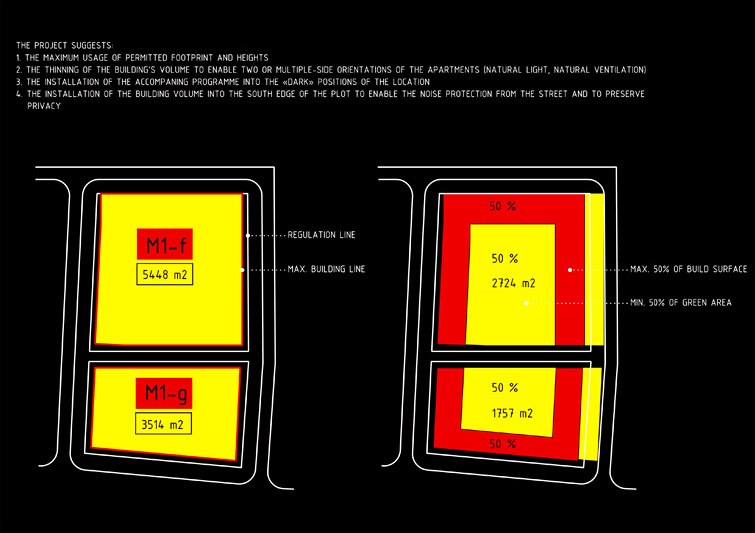 - To gain bigger usage of the building plot with adequate lower buildings project has to include functional surfaces inside built structures,