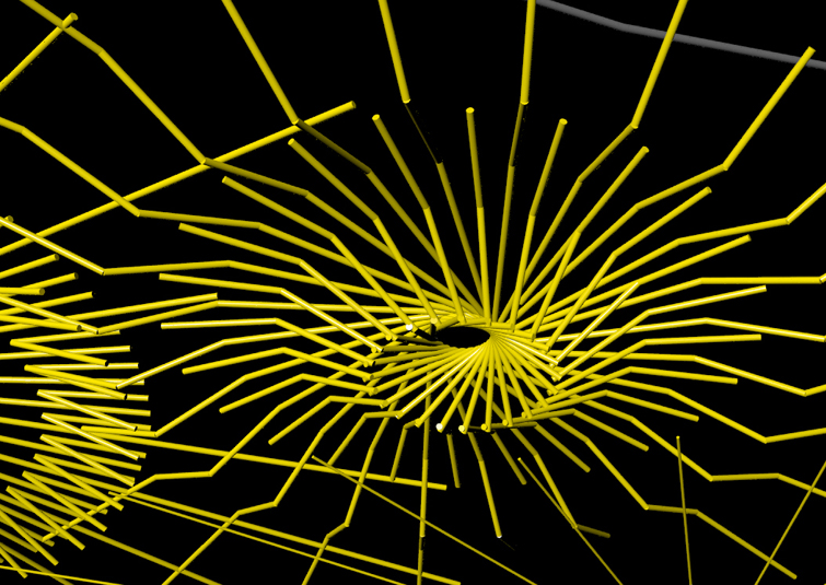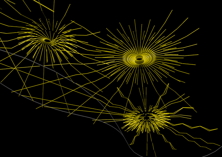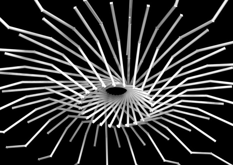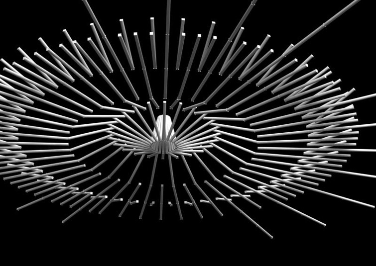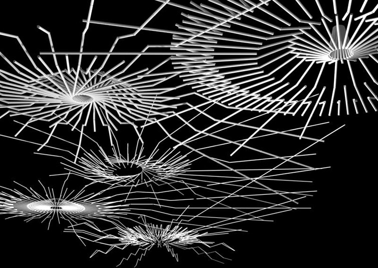 The program of the hotel casino Solei, more precisely, the entrance hall (with a reception desk, a bar and a restaurant) requires a representative ceiling lighting. The project tendency is to unite a functional element of the lighting with a decorative element on the ceiling. The entire ambient lighting becomes, at the same moment, its principal decoration. The elements are combined into various spatial formations which are related to the hotel program itself. Light intensity, the density of lihting elements in the formations increases or decreases proportionally with the program intensity. The whole ceiling turns into a lighting-net, an upside down light-topography.