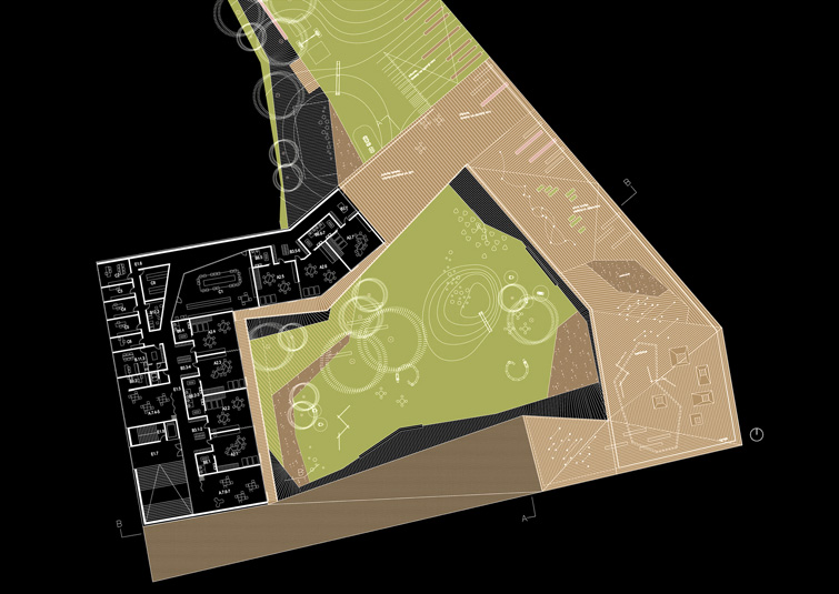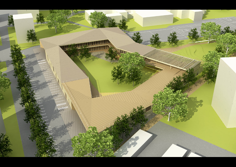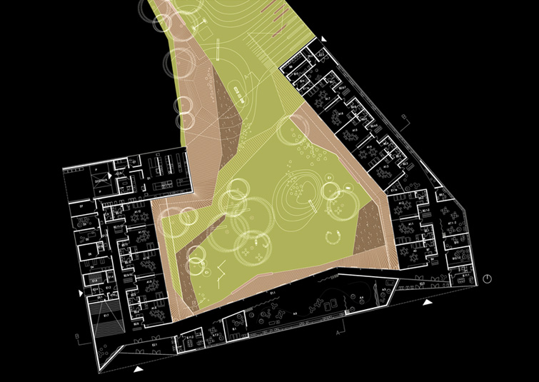 The quality of the urbanistic idea is visible also in organic connectivity of the spatial loop with the form of the building site. Its feature rises from the remote northern playground via wide green slope to the 1st floor level. It gradually rounds up around the central atrium across the assembled ascending roofs in the east, south and west tract and concludes itself into a semi-translucent pergola of the covered playground on the building roof.
