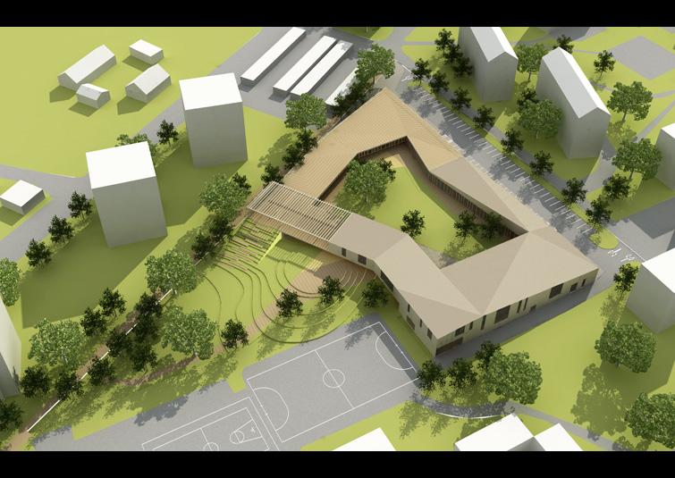 Formative design of the project is contemporary, uniform and non-intrusive to the environment. The relief dynamics of the roof is bold in conception and playful at the same time because it continues into a similarly designed relief of the playground which is structured with elongated and low elevations. The appearance of the building is conceived with a continuous membrane that corrugates in folded line throughout the whole volume, while two main entrances are folded concavely into the building.