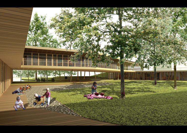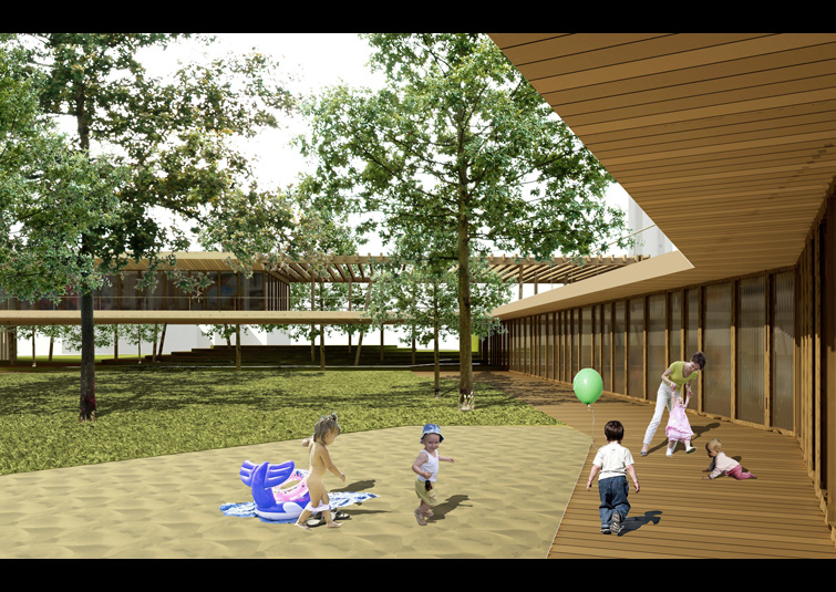 The experience of external space is graduated from the introverted central atrium and is suitable for the junior age groups, to the open ambience of the north part of the site for the older children, and in accordance with gradual development of child's consciousness, further to the external space.