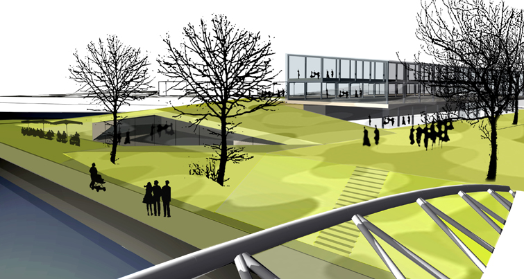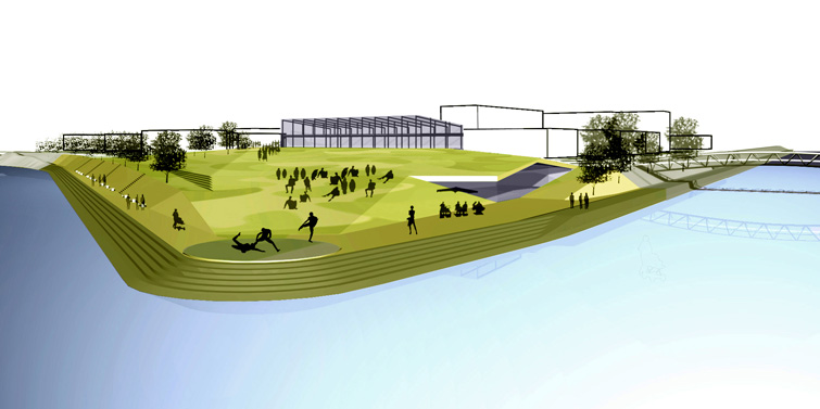 An urban park adjusts its conception to a river. It combines a compactness of an urban structure and its fluid traversing with a changeability of the landscape. Our movement and perception are gently guided; a fluid ascending and descending of the space are percepted and discovered gradually. The structured topography enables greater interaction to the landscape and its built structure.