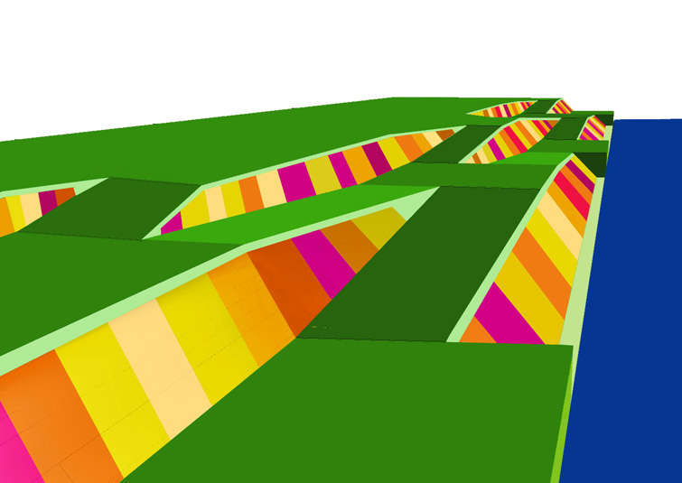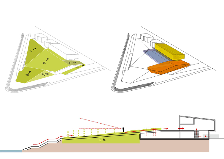 It presents a tendency to gradually connect the upper street level with the river bank. A formation of linear stripes, fluidly traversing one into another via the slopes, generate folded p