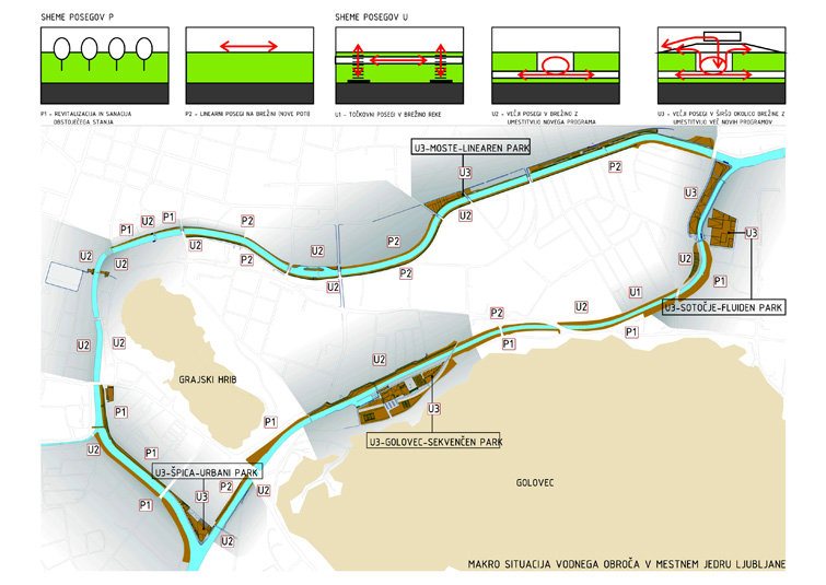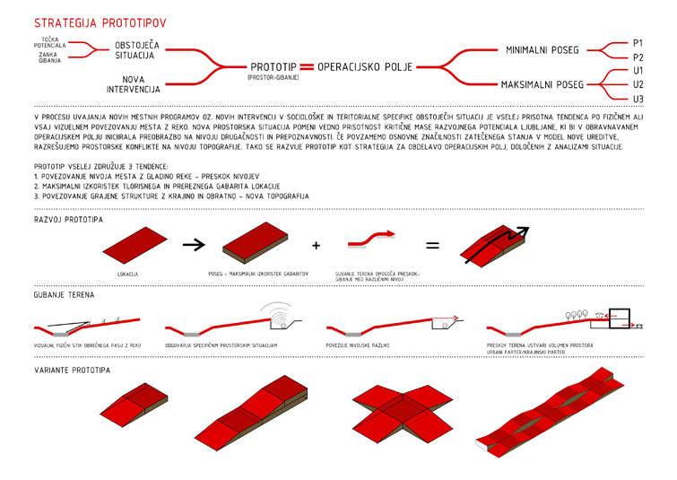 In the process of introduction of new urban programs and new interventions into sociological/social and territorial specifications of the existing environments, a tendency for a physical or visual connection of the city with the river is always present . A new spatial situation always means a presence of developmental potential of its critical mass in the city of Ljubljana. It should initiate the transformation on a level of diversity and recognition in the operational field. We resume basic characteristics of the existing environment, integrate them into the model of a new settlement and than we solve the spatial conflicts on a topographic level. Thus the prototype, as a strategy, is developed for handling all operational fields defined by the analysis of the situations.