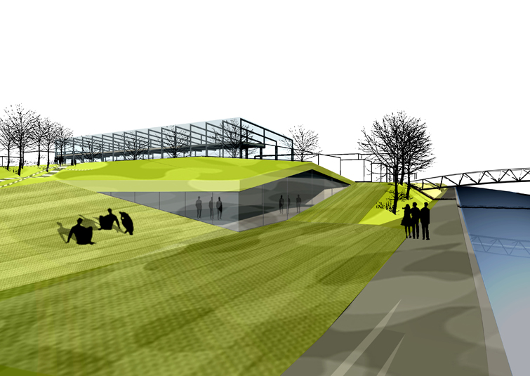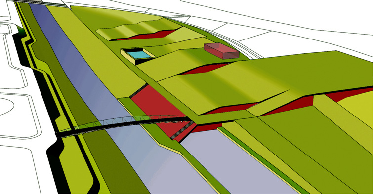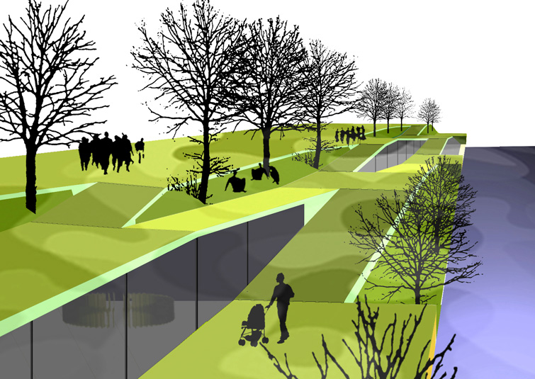 A rise of the slope enables a multi-layered functioning of the park ground floor.