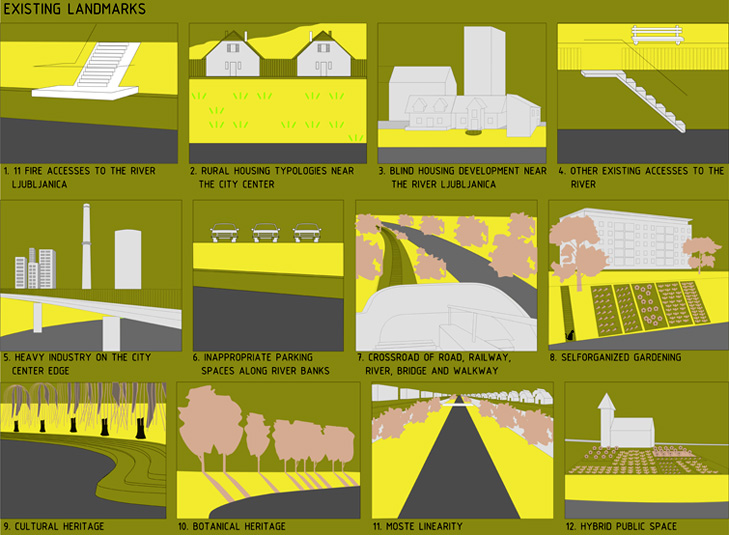 A quality architectural heritage in the historic part of the city, a collage of different typologies in the suburbs, existing tree-planted avenues on the steep grassy pedestals of the “Poljane” dykes, a linear movement, private gardens on the river quays, intimate acceses to the river, willows above the terraced meanders.