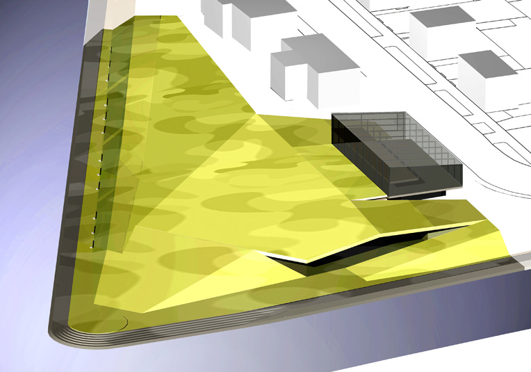 The urban park dimension/proportion is defined by a maximum site limits. The entire park becomes a gentle slope along the river. Park is combined of a parterre, a podium and a building-pavilion. The podium is composed of gentle slopes which enable fluid traversing between the ambiences, quality sights on the river, better physical connection of the park with the river and better difference in height from the street.