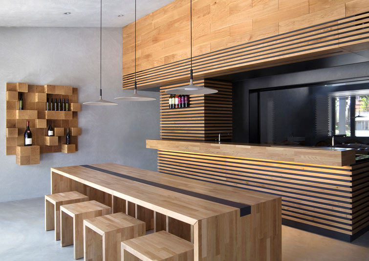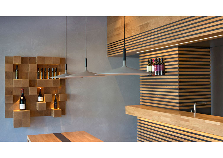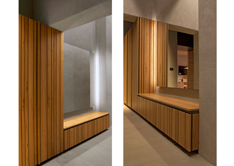 The furnishing, custom-made from the oak wood, follows the basic geometry of the space and concentrates in few clusters which gradually direct the visitor's focus from one room to another. The walls, floors and ceilings are designed as homogeneous and monocromatic background with discreetly articulated texture of freehand patterns made in special raw mortar.