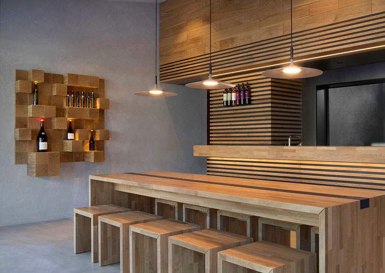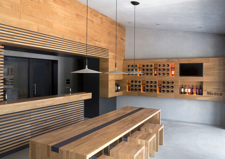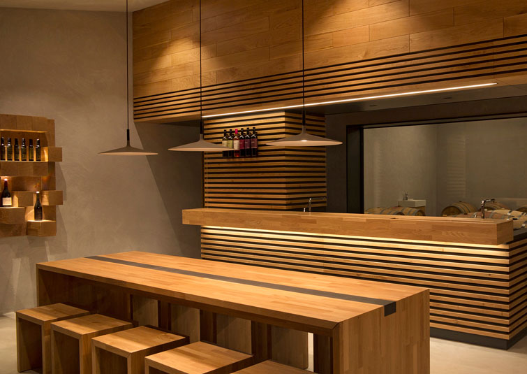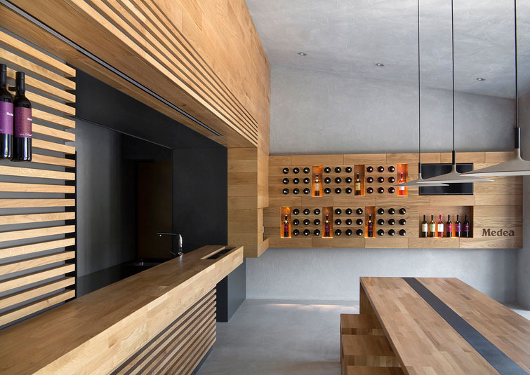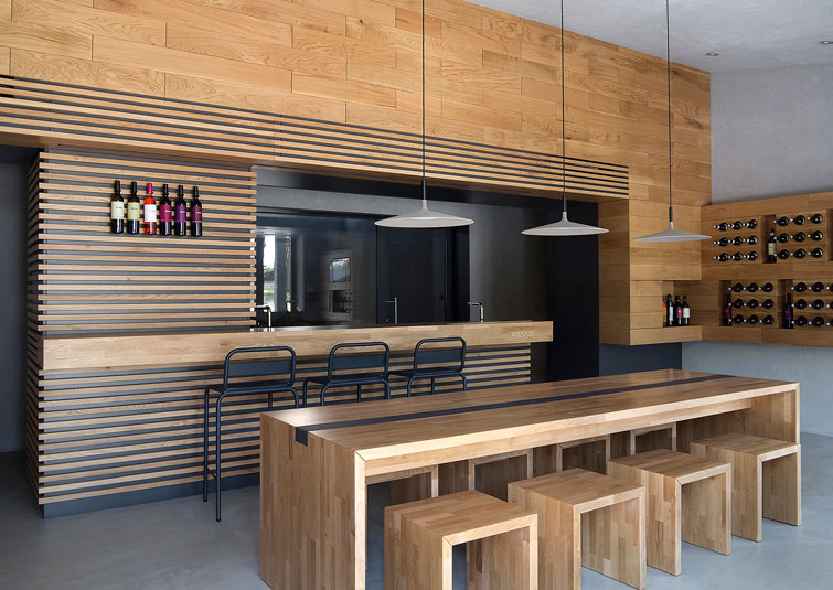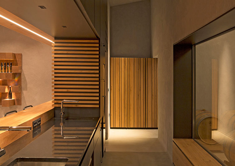 The space is articulated by depth. The tasting room is the size of a living room, big enough to host guests and small enough to keep the intimacy of the place. The long massive table for ten people holds a central position around which gathering and social contact takes place under the intimate lighting of suspended lamps. Between rooms, on the intersection of guests and employees paths, the counter is positioned to generate circular movement as well but also as the communication with production and service units. It works as a control bridge from which the whole place can be seen. The maturation room is placed at the background of the ambient like a mise-en-scene where the oak barrels are the "visual theme" showing the essential story of the whole place. Two rooms communicate visually and physically through the large glass wall which enables unobstructed view all the way from the entrance across tasting room to the room for barrels.