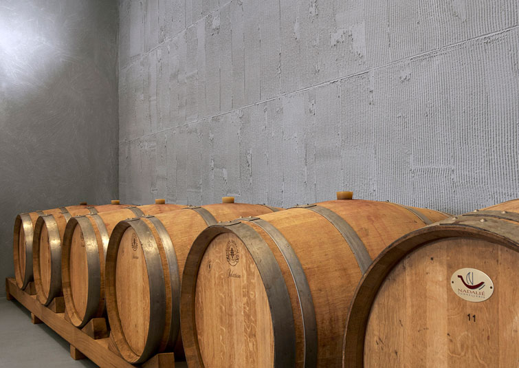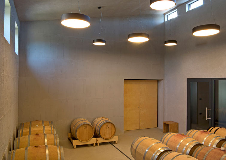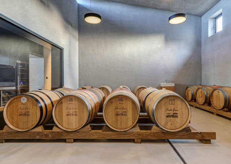 Visitor enters the newly furnished tasting room from a wide portico covered with a steel pergola, the only added element on the facade. The story of two rooms, "the tasting room" and "the maturation room", begins from here. The interpolation of the rooms just next to winery's production premises generates the space of dynamic opposites in which two different but visually and functionally connected ambiences meet. A dynamic one meant for guests and the other meant for maturation of wine and silence. Besides primary purpose of tasting and selling wine and olive oil products, the visitor is provided with direct insight in wine production as well.