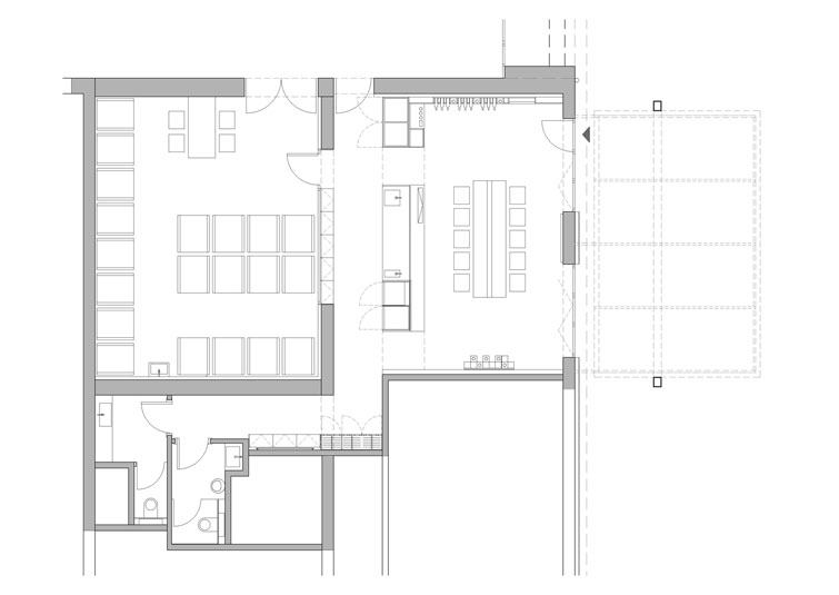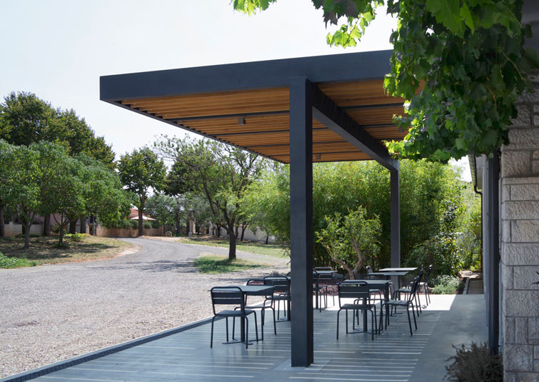 Successive gradation of the space is further enhanced with the extension of the interior onto the terrace in front of the building covered with a console steel pergola. Designed as an independant structure, pergola touches the existing volume just visually, with tangential line of the pergola frame edge. It is glazed on the top and filled with oak shutters between a framework under which the old grape wine planted when the winery was built will eventually grow.