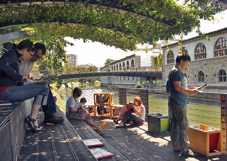 The spatial intervention on Petkovskovo embankment is a temporary public space created as a element of urban equipment. The goal of the project is to activate the ambiences around the river Ljubljanica and to research the response of the visitors with concrete example. This water pavilion is meant for periodic cultural events and for all citizens and visitors of Ljubljana who want to spend their leisure time by the river. The most popular is the »Library under the treetop« which enables the visitors to read in quietness enjoing the view of the river under the green roof of the pavilion.
