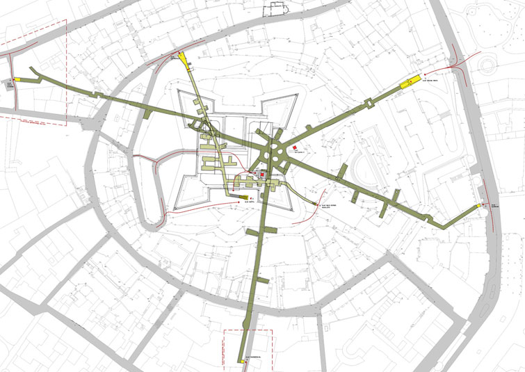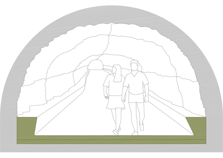 Underground tunnels could be perceived as an alternative pedestrian network of the city or as a pedestrian subway, in the means of shortcuts and different way of moving through the city. The tunnel network connect all important interest points of the city for they were made for sheltering the military personnel and are strategically situated with excellent spatial organization. Also, existing network is naturally ventilated with special ventilation system of secondary vertical tunnels which provide fresh air from the surface. Air temperature is constant and serves as perfect runaway from heated streets in the summer time. Underground tunnels are already opened for visitors in the summer.
