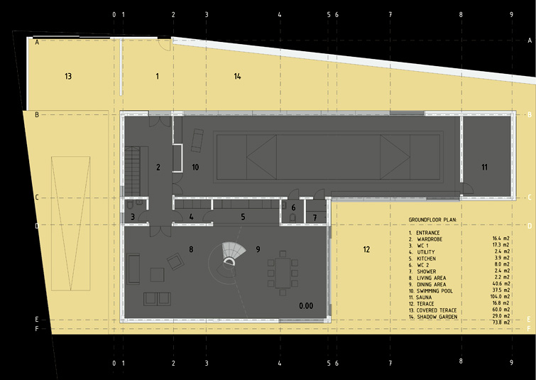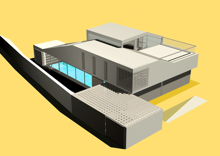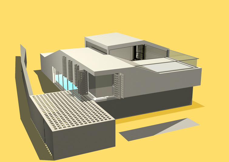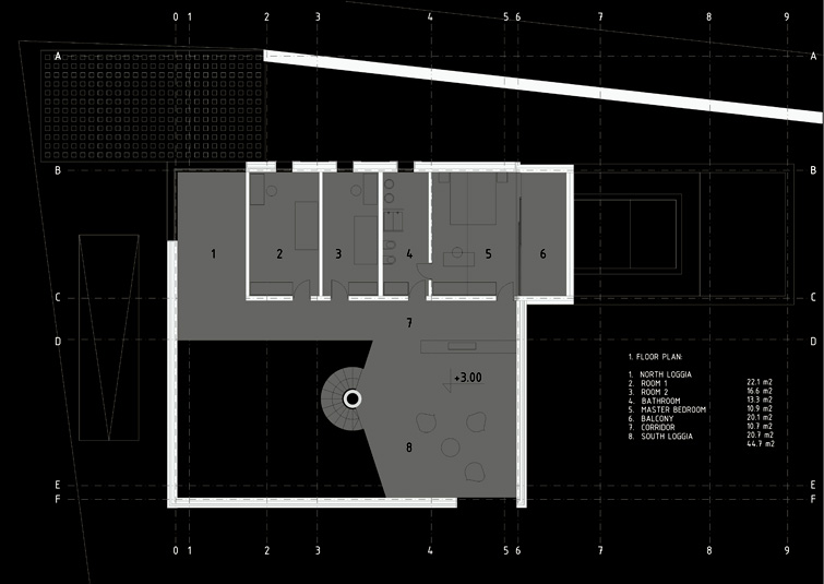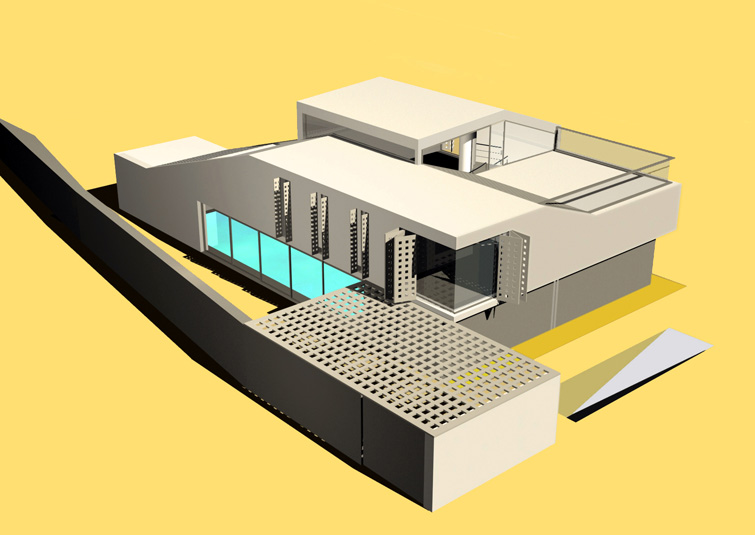 The groundfloor is divided with a service complex into an entering area with a winter swimming pool and to a living area with a dining room. Three bedrooms and a bathroom, as the only closed volumes,divide the south and the north loggia on the first gallery (3m).