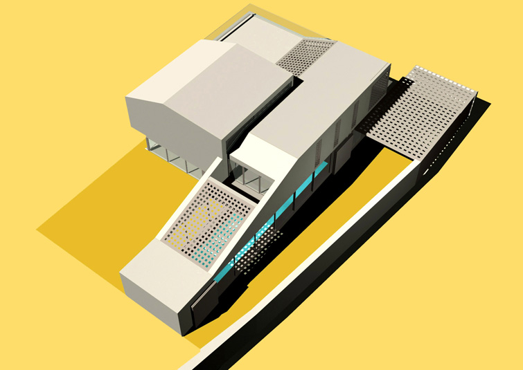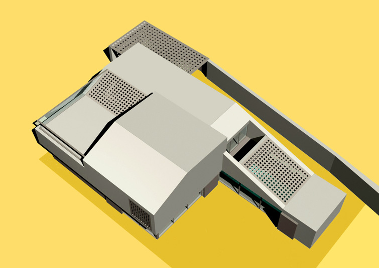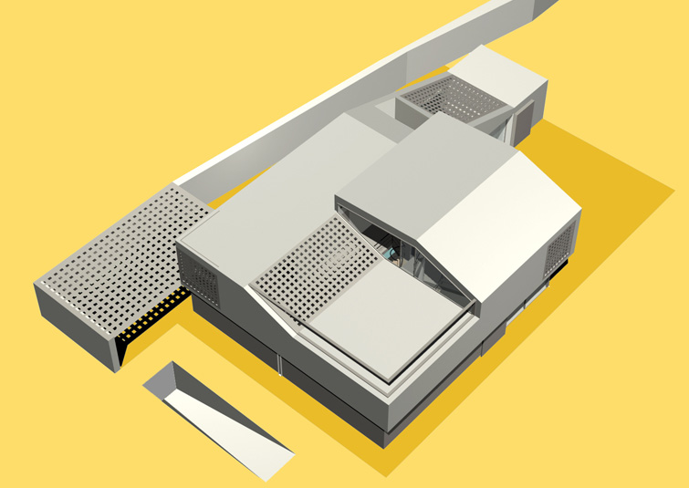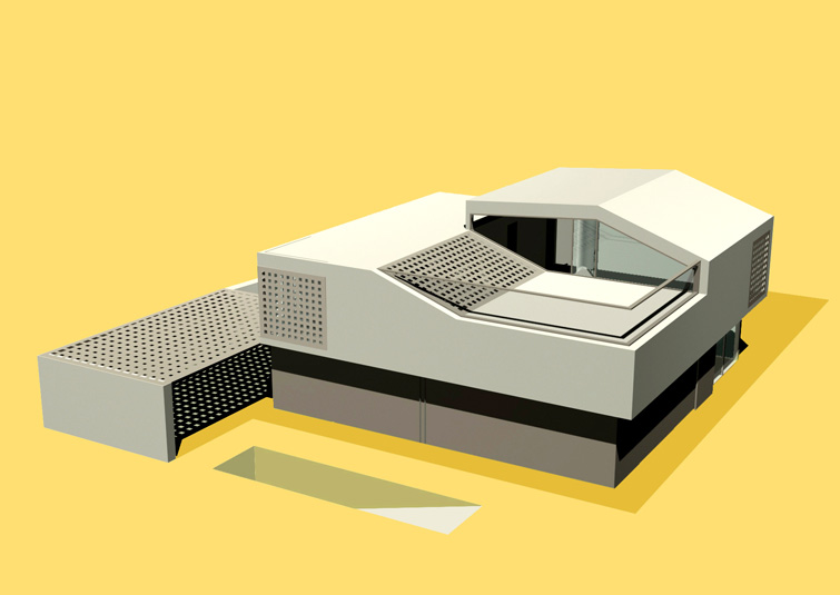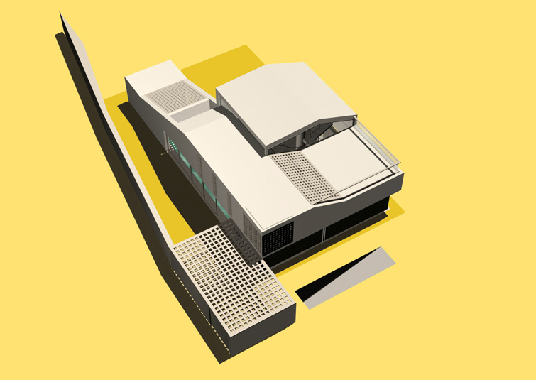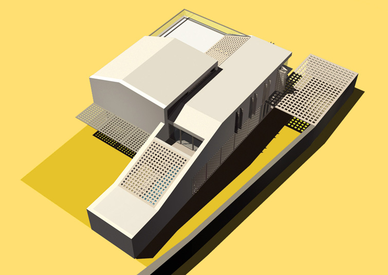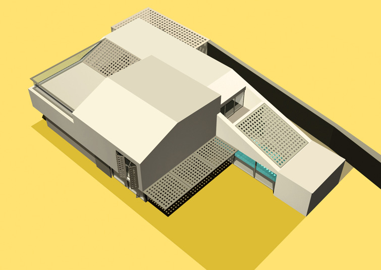The raised periscopic volume of the south loggia enables additional sunlight into the very center of the house. Classical opennings on the facade are screened with perforated panels.
