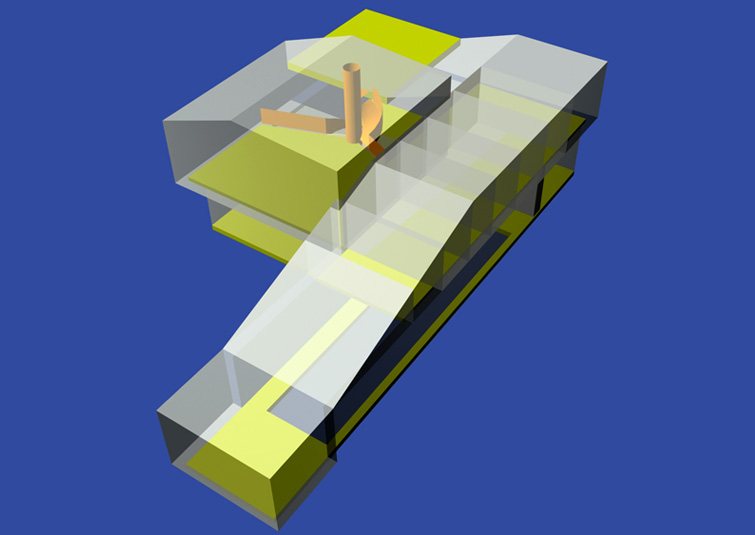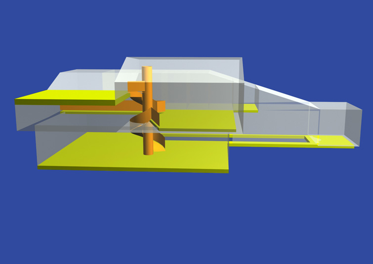 The form of the house is a result of its interior organisation. It uses a duble helix shape,with its axle as a communicational and constructional "trunk". At the same time, the pillar-trunk bears the integrated fireplace inside it, two galleries on different levels and a staircase wrapped around it.